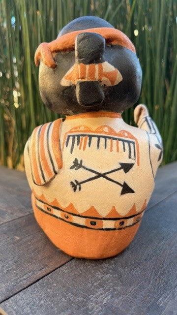 This striking Cochiti Pueblo drummer figurine by Mary Martin (Tsiranitsia) is beautifully detailed and full of character. The drummer is dressed in a finely painted vest with black-and-white striped trim, a striped blanket draped over his shoulder, a buttoned shirt, and a shell necklace. His separate pottery drum rests in his lap, though the original drumstick is no longer present. The back of his vest features traditional rain cloud and crossed arrow designs, while his arms are adorned with floral motifs.